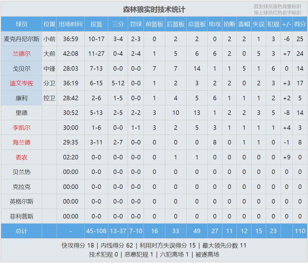 愛德華茲因膝蓋傷勢,多森姆因小腿傷勢,兩人今天都沒打。第四節(jié)麥克丹尼爾斯傷退,戈貝爾6犯離場。里德在加時賽被驅(qū)逐,蘭德爾和老康利帶著一個森林狼殘陣,加時賽完成驚天大逆轉(zhuǎn)。為啥說這場下飯?看看第四節(jié)和加時賽!