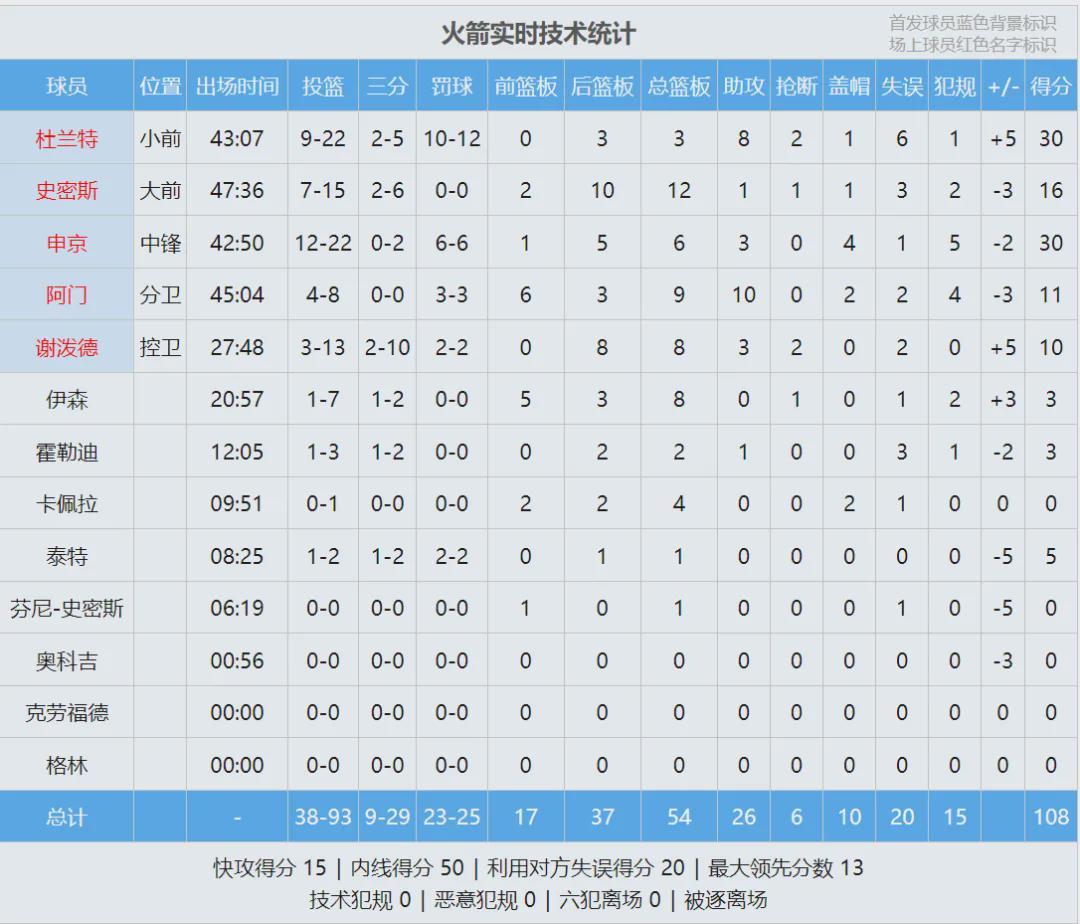 小香農(nóng)前四節(jié)沒打,加時賽只出戰(zhàn)最后2分20秒,正負(fù)值+9全隊最高。終場哨聲響起,杜蘭特滿臉失望。全場比賽,杜蘭特22中9,砍下30分3板8助2斷1帽6失誤,正負(fù)值+5。申京30分6板3助4帽、小賈巴里-史密斯16分12板。
