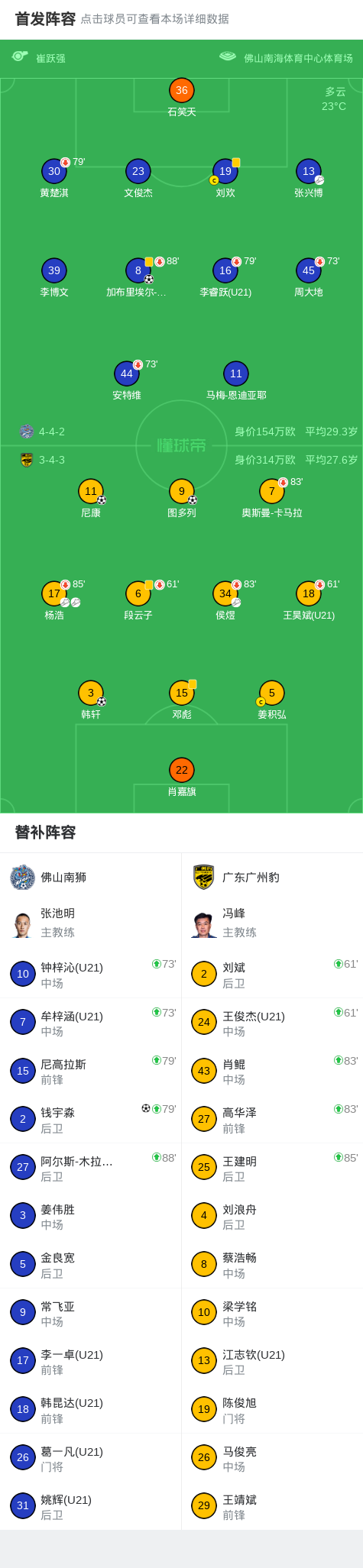 北京時間3月21日中國足球甲級聯(lián)賽 聯(lián)賽 第2輪,佛山南獅主場對陣廣東廣州豹。佛山南獅加布里埃爾-比斯波破門,錢宇淼破門。廣東廣州豹尼康破門,韓軒破門,圖多列破門。最終比分佛山南獅 2-3 廣東廣州豹。