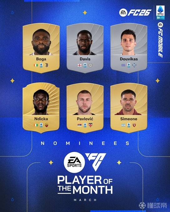 北京時間3月26日,意甲3月最佳球員候選名單公布,這6名球員為博加、凱南-戴維斯、杜維卡斯、恩迪卡、帕夫洛維奇、喬瓦尼-西蒙尼。